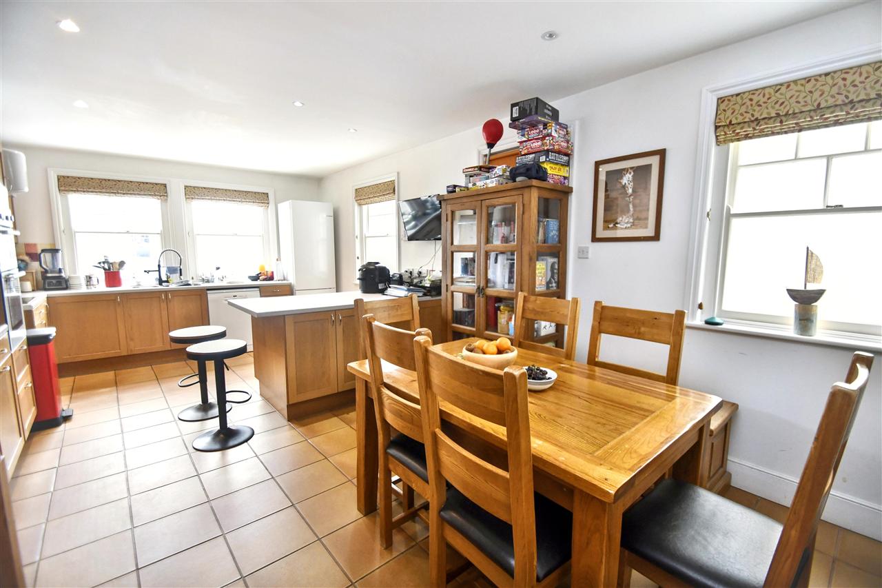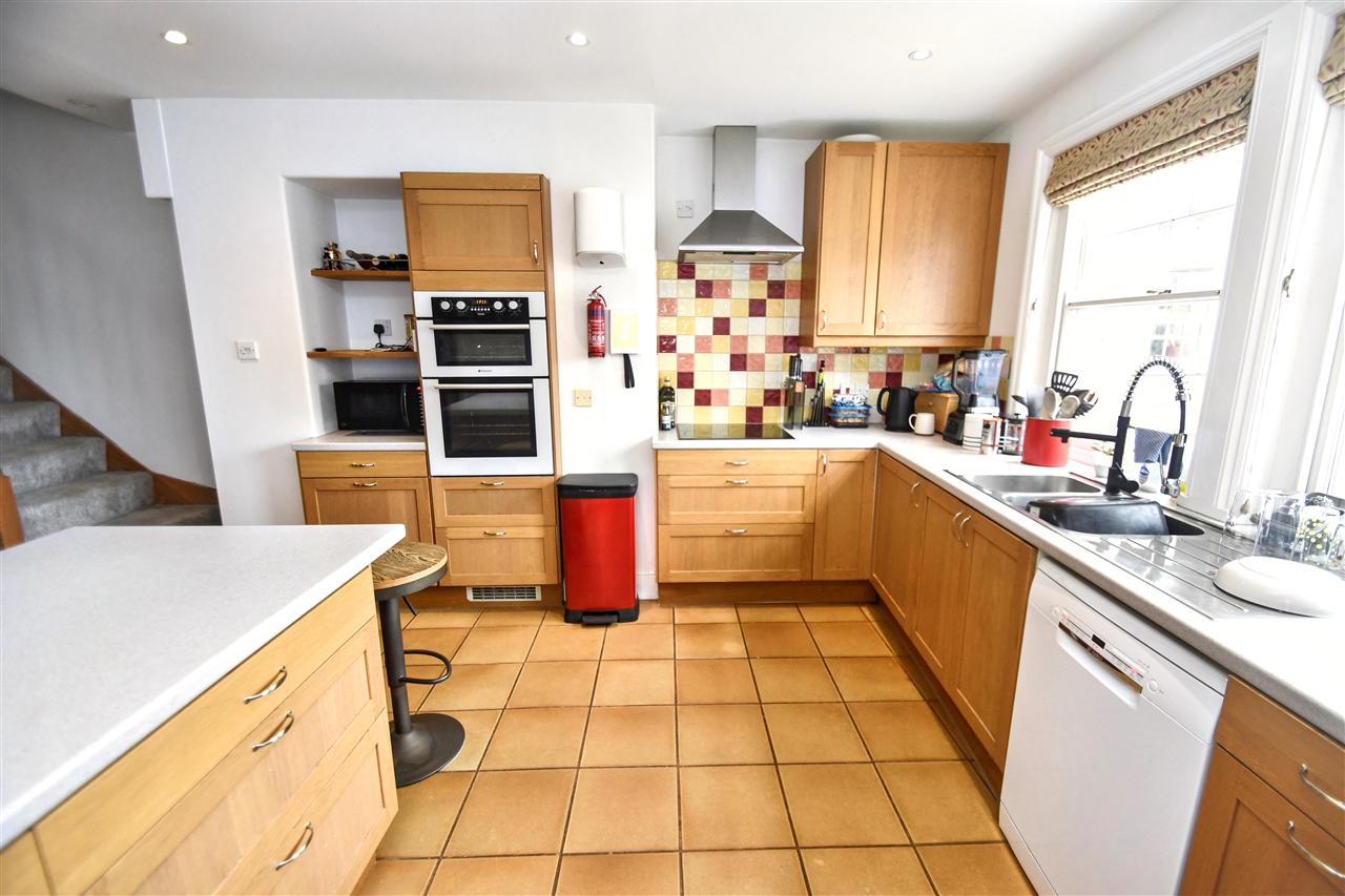 A spacious kitchen/diner being a light and airy dual aspect room with well equipped kitchen. Fitted with a large range of wood fronted wall, base and drawer units with metal door furniture, roll top work surfaces, tiled splash back, 1 1/2 bowl stainless steel sink with drainer and mixer tap, hob with stainless steel extractor canopy, built-in double oven, recess and plumbing for dishwasher, sash windows with an outlook to the side and rear, plastered ceiling with downlights, tiled floor, closed tread staircase with balustrade leads to the first floor.