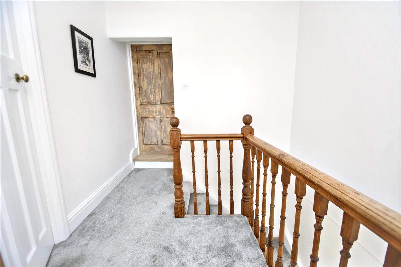 Plastered ceiling with ceiling light and loft trap giving access to the roof space, carpet, doors to bathroom and two bedrooms and the second staircase.