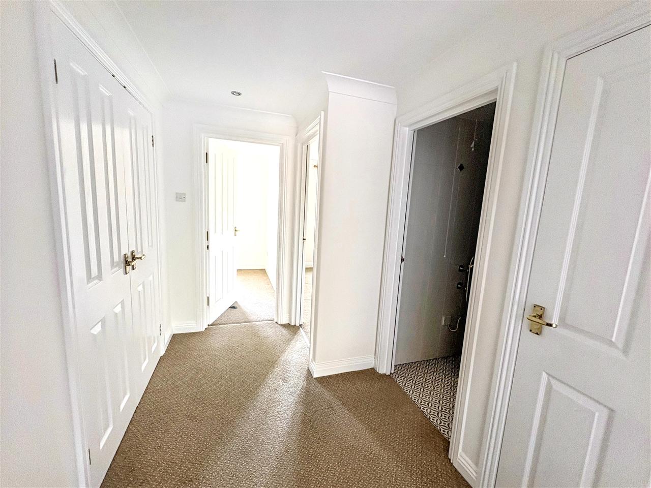 Entrance hall with intercom, fitted carpet, inset spotlights, cloak cupboard which houses the electric meter and consumer box, and a second storage cupboard which houses the storage tank.