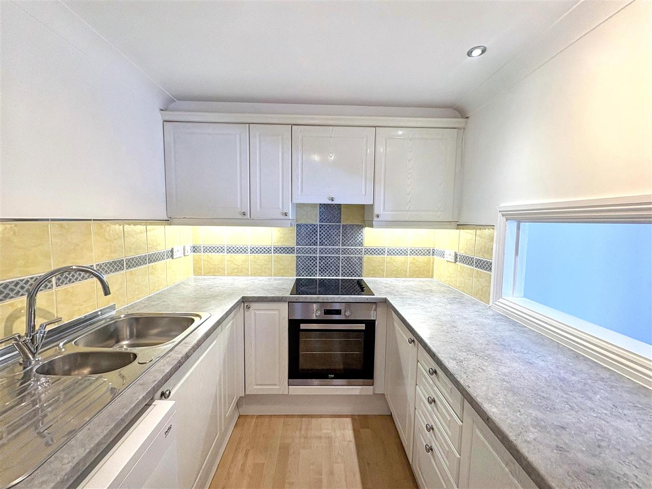 Accessed through a white wooden door with brass handle, a range of wall and base units, roll top work surface with ceramic tiling, single drainer stainless steel sink unit with chrome mixer tap, space for washing machine, dishwasher, fridge freezer (these appliances are all included in the sale), beko fan assisted oven with extractor fan over, inset ceiling spotlights.