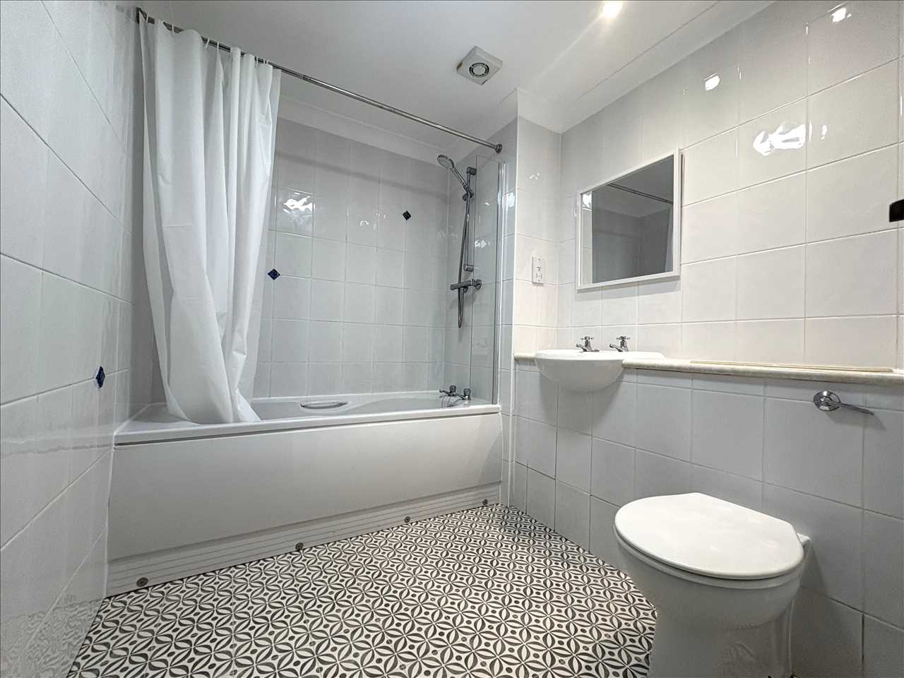 White suite comprising a panelled bath with chrome shower over, low level wc, sink with hot and cold taps, fully tiled with extractor fan, lino flooring and central ceiling light.