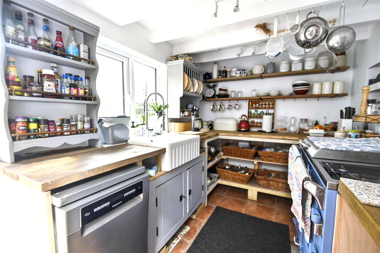 A recently fitted European farmhouse style kitchen with wrap around solid wood worktops housing a Belfast sink with modern mixer tap over, recent Everhot electric range oven with induction plates and tiled splashback, recess for slimline dishwasher, cupboard with solid wood doors and shelving, UPVC double glazed window with fine views over the enclosed rear garden, patio door and matching side window opens on to the patio and gardens. Tiled floor exposed beam ceiling, feature sky light window, To the side is the utility room/larder.