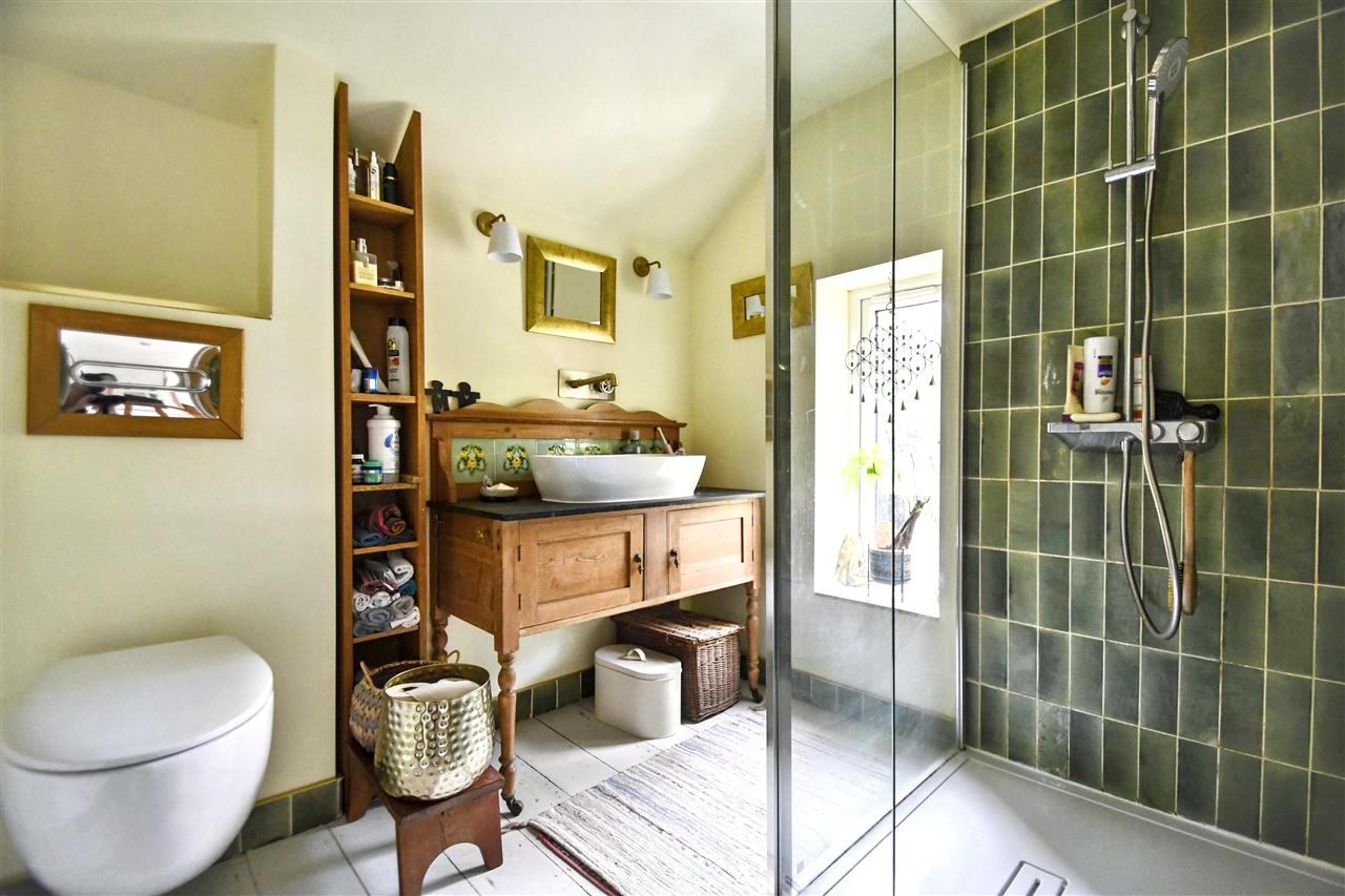 A recent beautifully fitted shower room with attention to detail, comprises of a walk in shower with glass screen and tiled surround, feature wash hand basin set into a vintage wash stand with slate top and tiled surround, low level wc with concealed cistern with push button flush, heated towel rail, UPVC double glazed window to the rear, plastered ceiling with down lights and finished with a wooden floor.