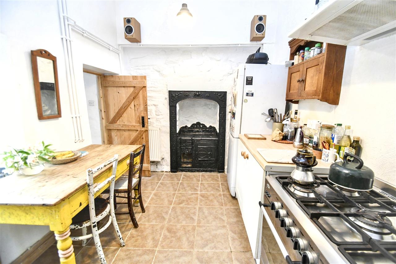 A simple fitted kitchen/breakfast room with double base unit and roll top work surface, single drainer stainless steel sink unit with cupboards under, wooden open shelving and wall unit, space for range style gas cooker, built-in old Cornish Range (show only), double radiators, painted rough cast walling, ceramic tiled flooring, recessed seal unit double glazed window with Venetian blind enjoying a pleasant outlook over the rear garden, stripped pine latch and brace door to: