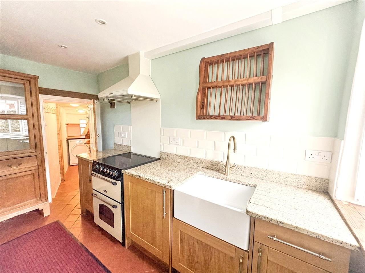 Windows overlooking the front aspect with shutters, a belfast sink with hot and cold mixer tap, splash back tiled surround, granite work surfaces, space for a cooker, space for a fridge freezer, tiled flooring and electric heater.