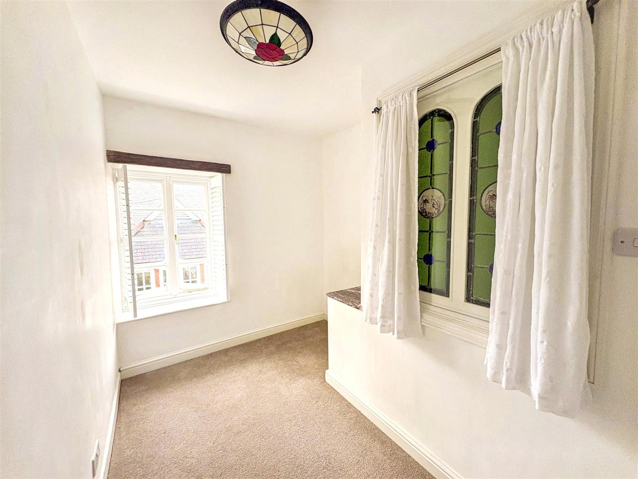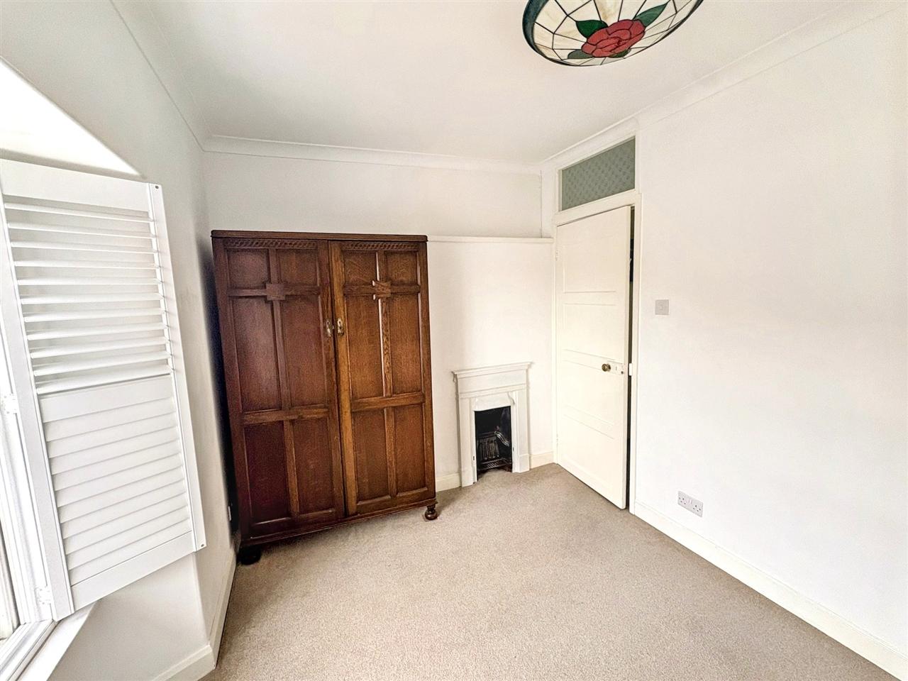 A good size bedroom with lots of light, single glazed window overlooking the front elevation with bespoke shutters, carpets, central ceiling Tiffany style up light, focal fireplace with surround.